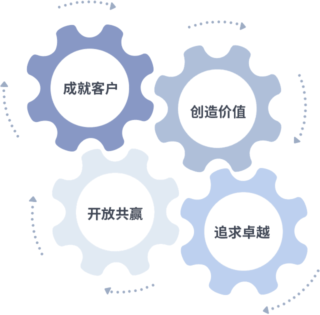 成就客户是一切决策的出发点,,,创造价值是衡量所有工作的标准,,追求卓越是我们做事做人的态度,,,,开放共赢是我们的格局也是最终的结果。。。价值观的齿轮环环相扣,,推动着组织里的每个人不断向前。。。